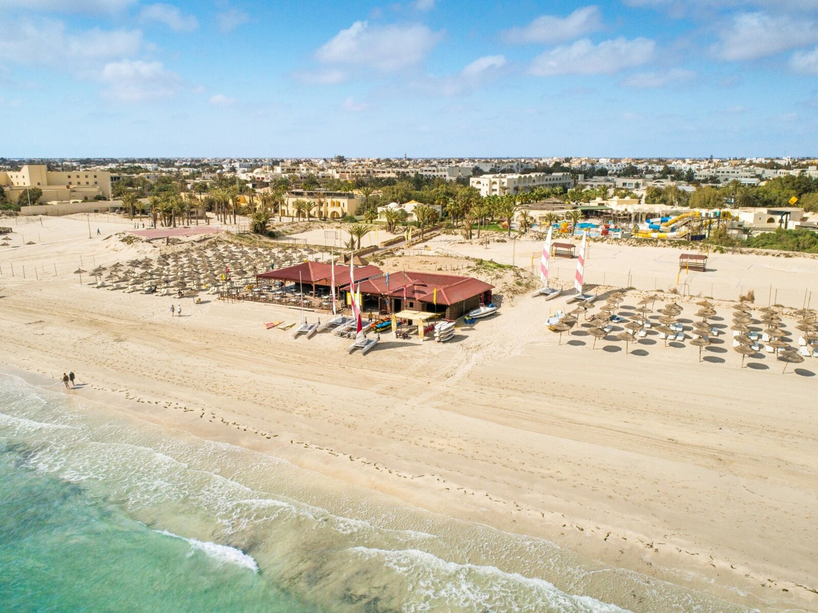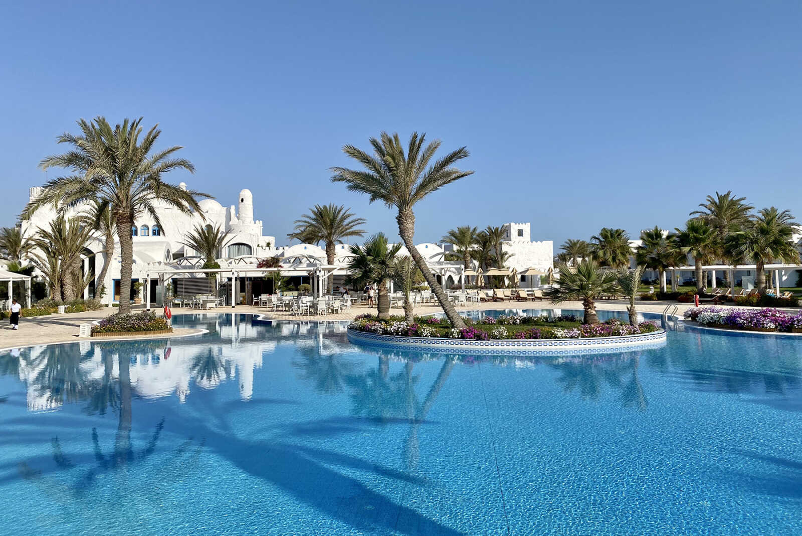 Nur wenige Kilometer von der Inselhauptstadt Midoun entfernt liegt der Club „ROBINSON Djerba Bahiya“. In der Anlage findet man alles, was man sich im Urlaub wünscht: eine riesige Poollandschaft, einen langen Strand, Spa, Sauna und Sportmöglichkeiten. Auspowern kann man sich beispielsweise im Fitnessstudio, auf den Tennisplätzen, in Soccercamps oder beim Beachvolleyball. 🏐