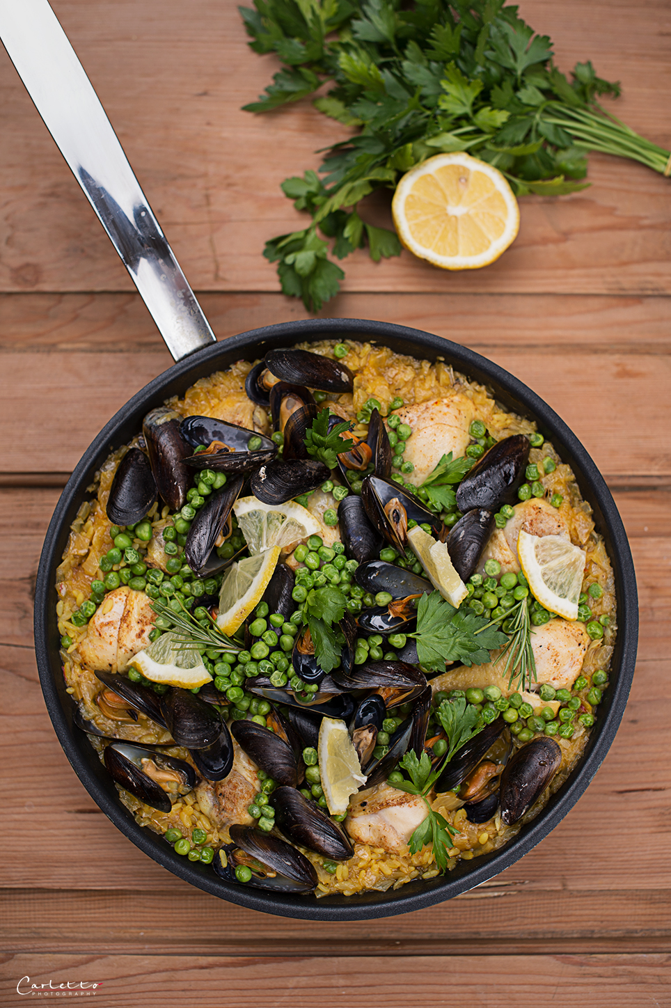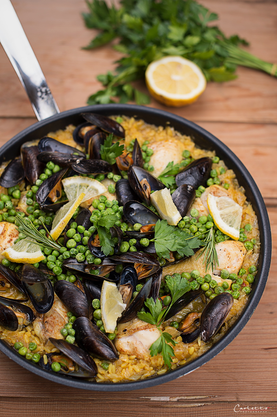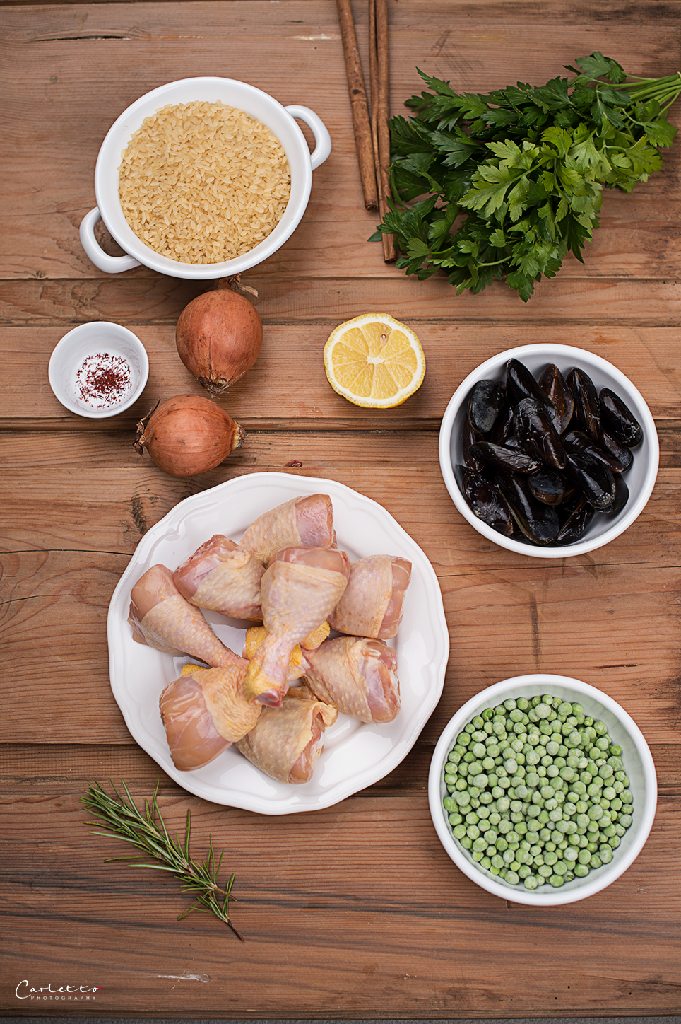 Die Zwiebel schälen und fein hacken. Die Petersilie waschen, von den Stielen befreien und fein hacken. Etwas Olivenöl in einer tiefen Pfanne erhitzen. Die Hendlschenkel darin von beiden Seiten für ein paar Minuten anbraten. Mit Paprikpulver, Salz und Pfeffer würzen. Die Hühnerschenkel aus der Pfanne nehmen und zur Seite stellen. Die Zwiebeln in die Pfanne geben und unter Rühren glasig dünsten. Den Rundkornreis hinzufügen und kurz rühren. Mit Weißwein ablöschen. Die Hühner- oder Gemüsebrühe und den Saft einer halben Zitrone hinzugeben. Den Safran und die gehackte Petersilie unterheben. Anschließend wieder entfernen. Mit etwas Salz und Pfeffer würzen. Die Zimtstange dazugeben und für ein paar Minuten mitgaren lassen. Die Hühnerschenkel hinzufügen und mit geschlossenem Deckel bei mittlerer Hitze für 10 bis 12 Minuten garen. Die sauber unter kaltem Wasser gewaschenen Muscheln hinzufügen und nochmals 10 Minuten mit Deckel fertiggaren. Nach weiteren fünf Minuten die Erbsen obenauf geben und mit Deckel fertig garen.