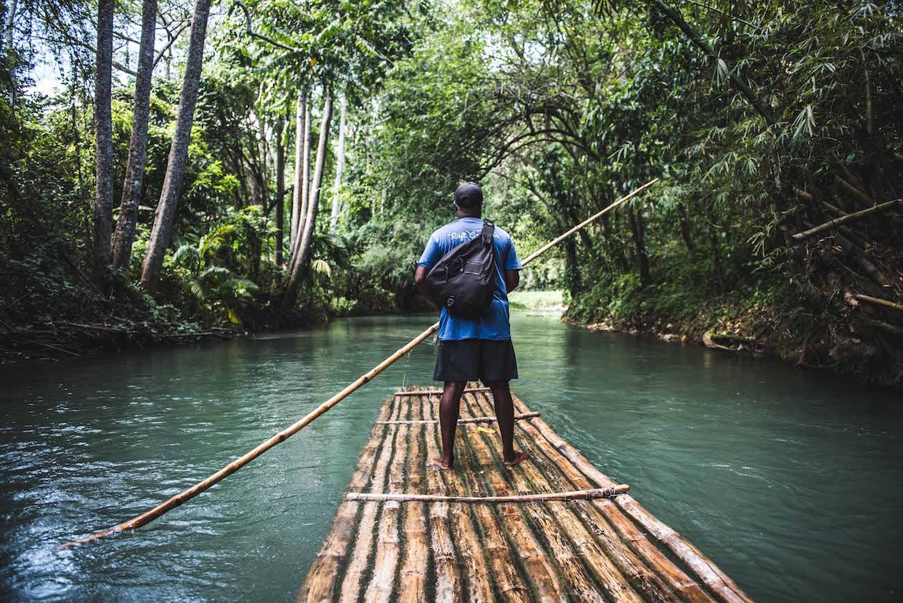 Unser Floßkapitän nennt es Rafting, wir würden es eher als „romantische Bootsfahrt“ bezeichnen. Auf dreizehn zusammengebundenen Bambusrohren treiben wir den Martha Brae Fluss entlang und genießen die Stille des Dschungels. Das Wasser hier hat Trinkwasserqualität, erklärt uns unser Floßkapitän. Mit einem langen Bambusrohr navigiert er uns gekonnt durch die „Stromschnellen“.