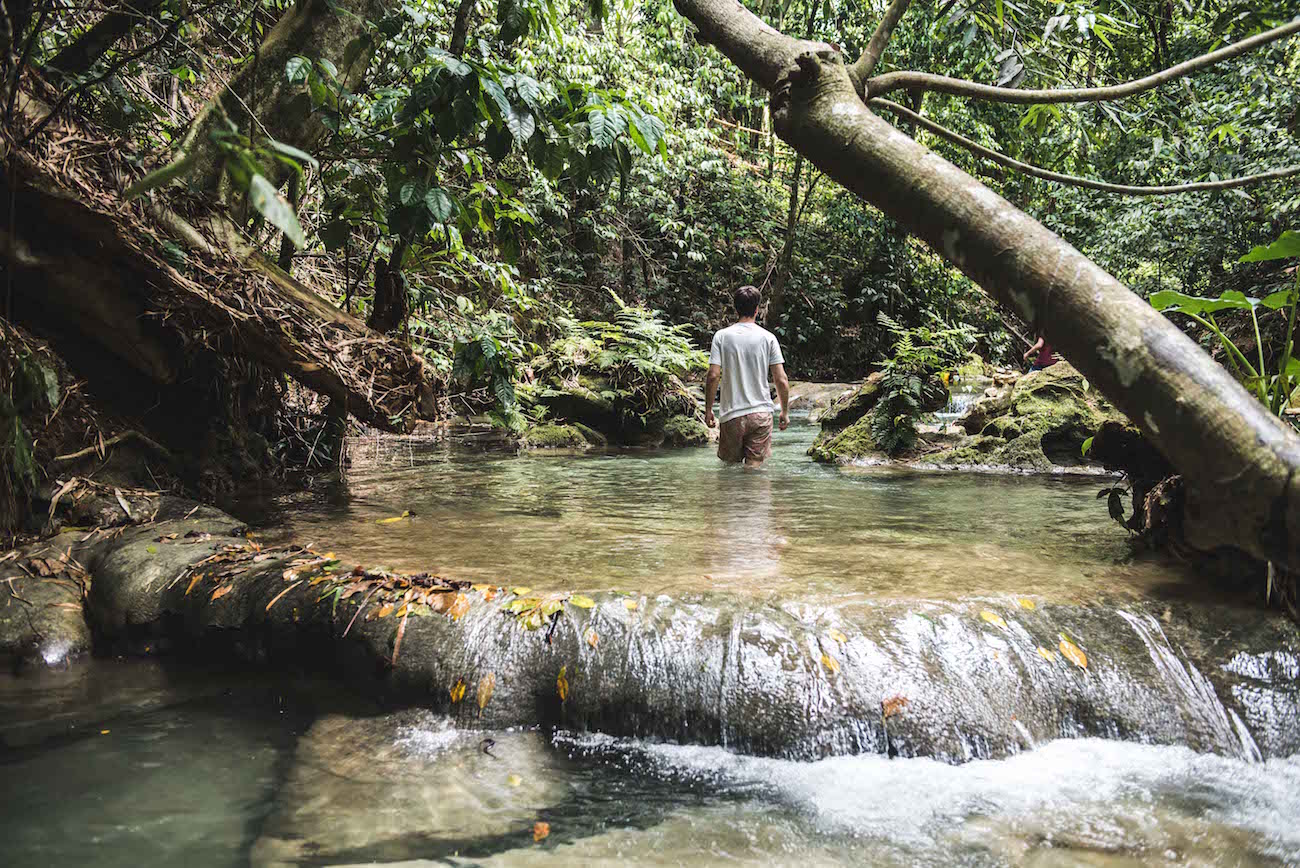 „Jungle vibes“ gesucht? Dann werden euch die Mayfield Falls begeistern! Über eine wackelige Bambusbrücke gelangen wir in das tropische Naturparadies. Begleitet von Guide Wayne bahnen wir uns unseren Weg flussaufwärts. Zwei beeindruckende größere Wasserfälle und unzählige natürliche Pools gibt es hier. Die Hitze lässt uns nicht lange zögern: wir wagen den Sprung ins kühle Nass und gönnen uns eine Dusche unter den kaskadenartig hinabstürzenden Wasserfällen. Völlig durchnässt wartet am oberen Ende des Flusses schon unser Mittagessen auf uns: „Chicken Jerk“, Jamaikas Nationalgericht. Yummy!