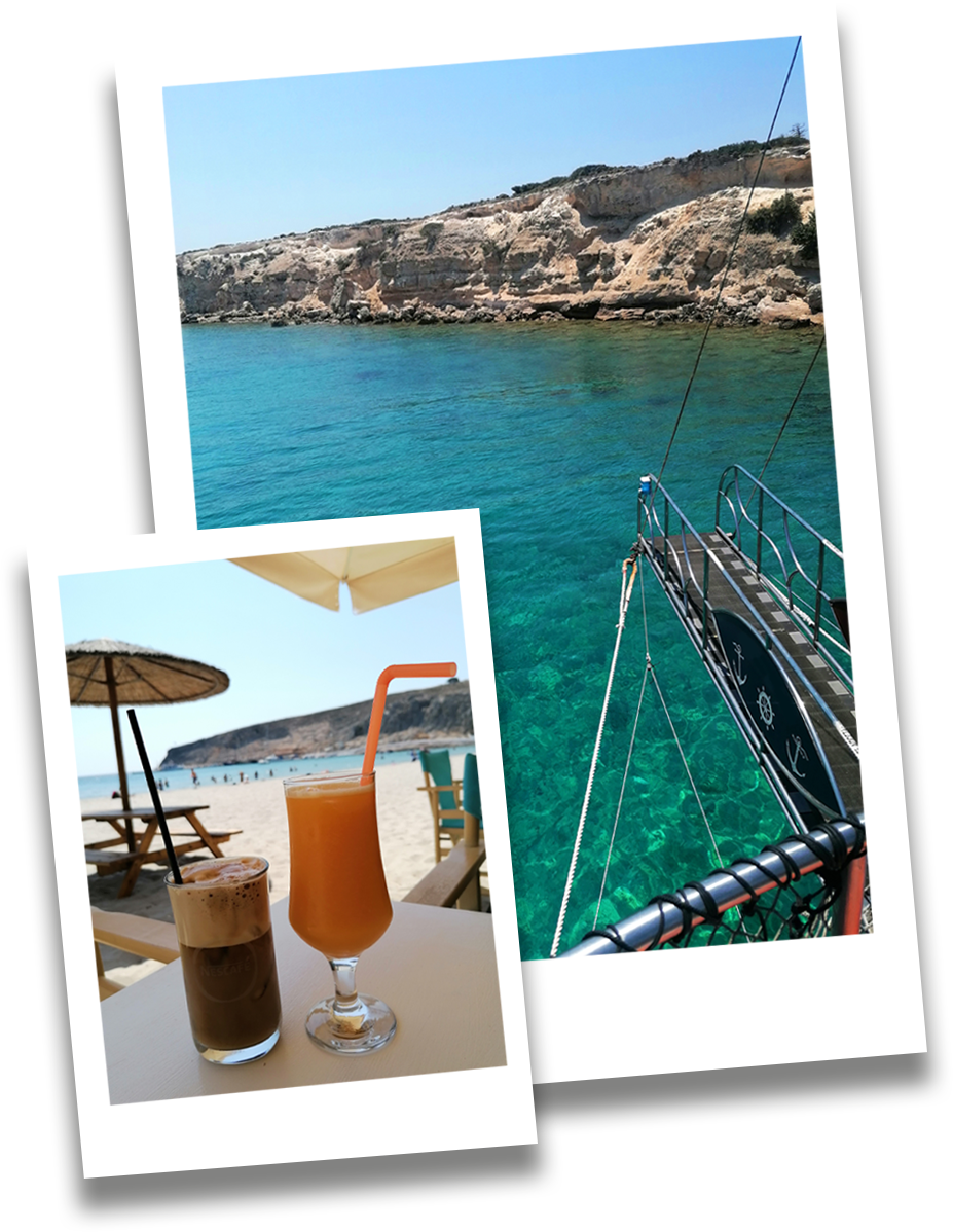 - Mein absolutes Highlight war … die ganztägige Bootstour zu den 3 Nachbarinseln Kalymnos, Pserimos und Plati. Nach der Überfahrt und Ankunft im kleinen Hafen auf Kalymnos hat man Zeit für ein typisch griechisches Mittagessen und Erkundung des kleinen Dorfes. Anschließend ankert das Boot für einen Schnorchel- und Schwimmstopp vor der Insel Plati. Zum Abschluss wird noch die malerische Bucht im Hafen von Pserimos besucht. Hier hatten wir genug freie Zeit für einen erfrischenden Café Frappé bzw. einen köstlichen frisch gepressten Organgensaft an der Strandbar. Während der Tour hatten wir sogar das Glück Delphine zu beobachten, die spielerisch dem Boot gefolgt sind.