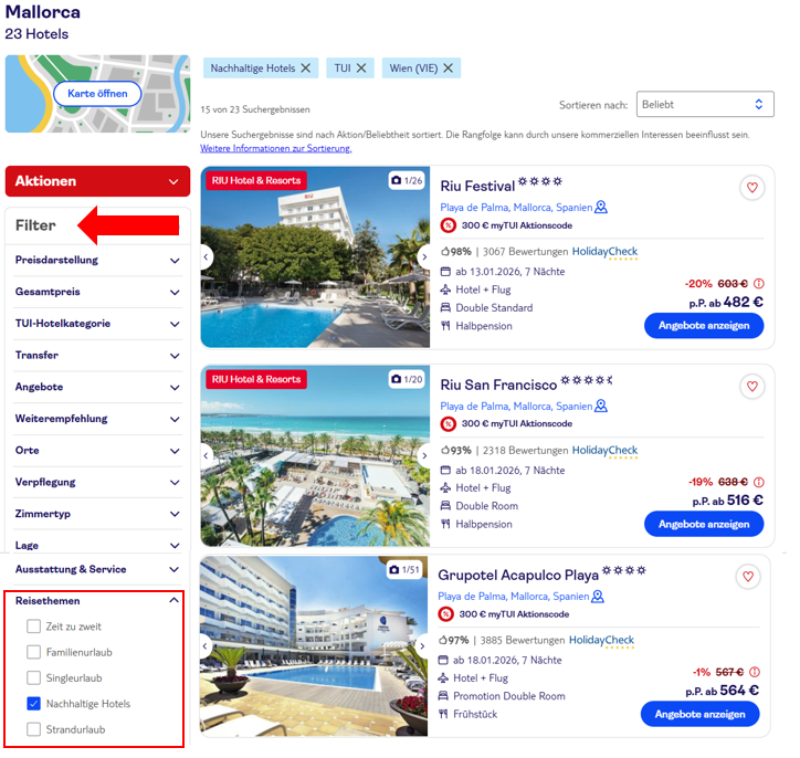 Befinden Sie sich auf tui.at geben Sie bitte Ihre Suchkriterien in die Angebotssuche ein und klicken auf „Angebote finden“. Nach Anzeige aller Hotels können Sie über die Filterfunktion unter dem Punkt Reisethemen "Nachhaltige Hotels" auswählen".