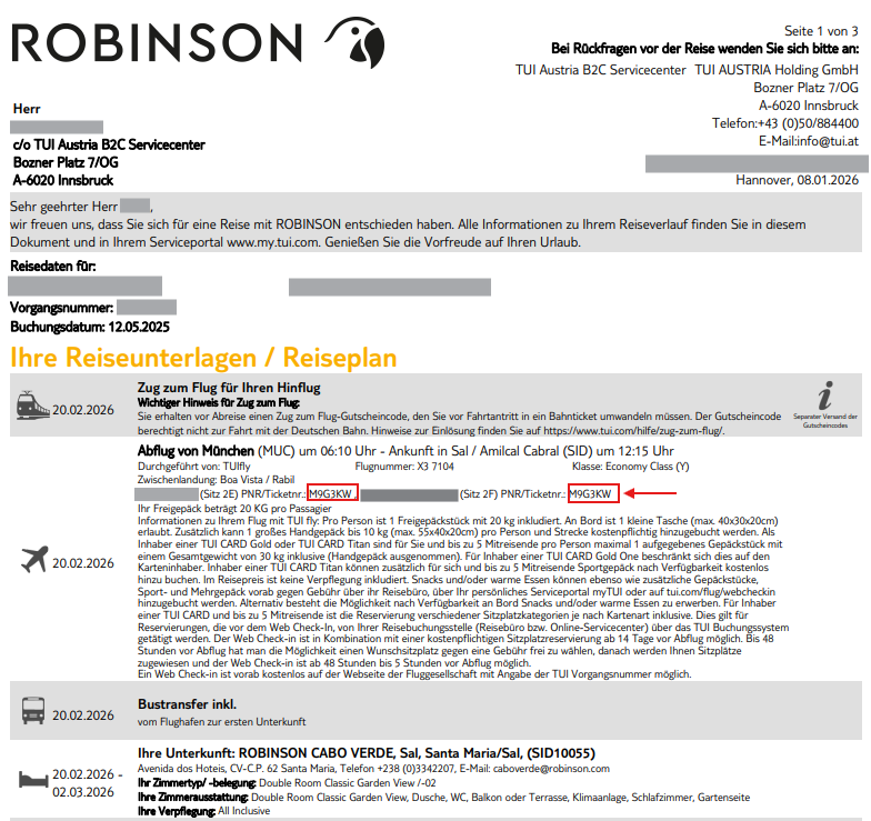 Auf dem Reiseplan der TUI Pauschalreisen finden Sie den Buchungscode hier: