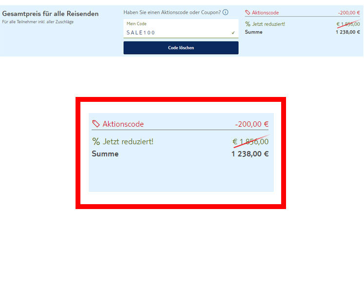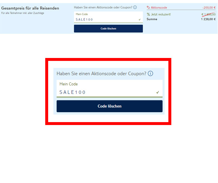 Für jeden Aktionscode bzw. Coupon Code gibt es bestimmte Einlösebedingungen, die erfüllt sein müssen, damit der Code gültig ist. Solche Bedingungen sind zum Beispiel Reisezeitraum, Mindestreisedauer oder Mindestreisepreis - diese finden Sie immer auf den jeweiligen Aktionsseiten.